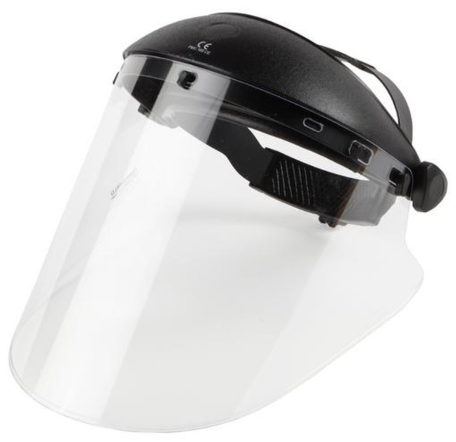 - The injection molded polycarbonate clear shield is shaped to hug your chest and side of your face when in use, and pivots up and out of the way when your task is done